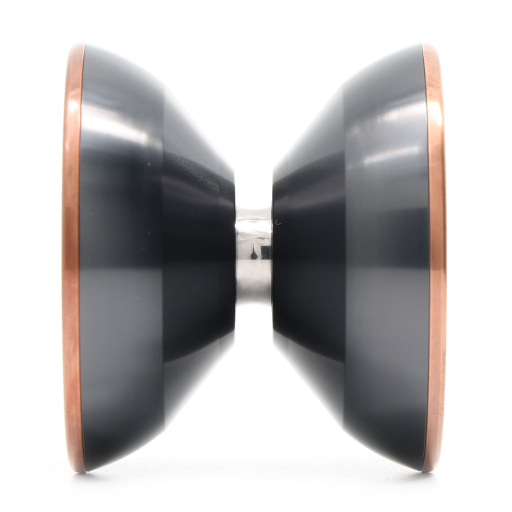今作はリムにステンレスより比重の重い銅合金を採用したバイメタルモデル。小柄なボディですが、外にせり出すリムにしっかりと重量が乗っているため、スリープの粘りはかなりのもの。スリープの後半まで安定して回転し続けてくれます。意外にもバイメタル特有の投げ出しの引っぱり感やクセは少なく、扱いやすいモデル。プレイ中はヨーヨーの重さを感じられ、加えた力がダイレクトにヨーヨーに伝わり、思ったところにヨーヨーを動かせる操作性の高いヨーヨーです。