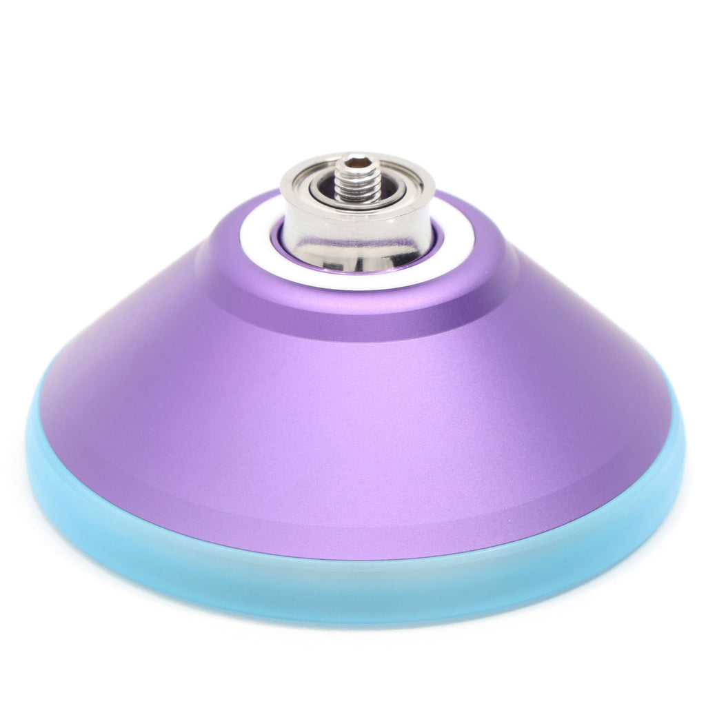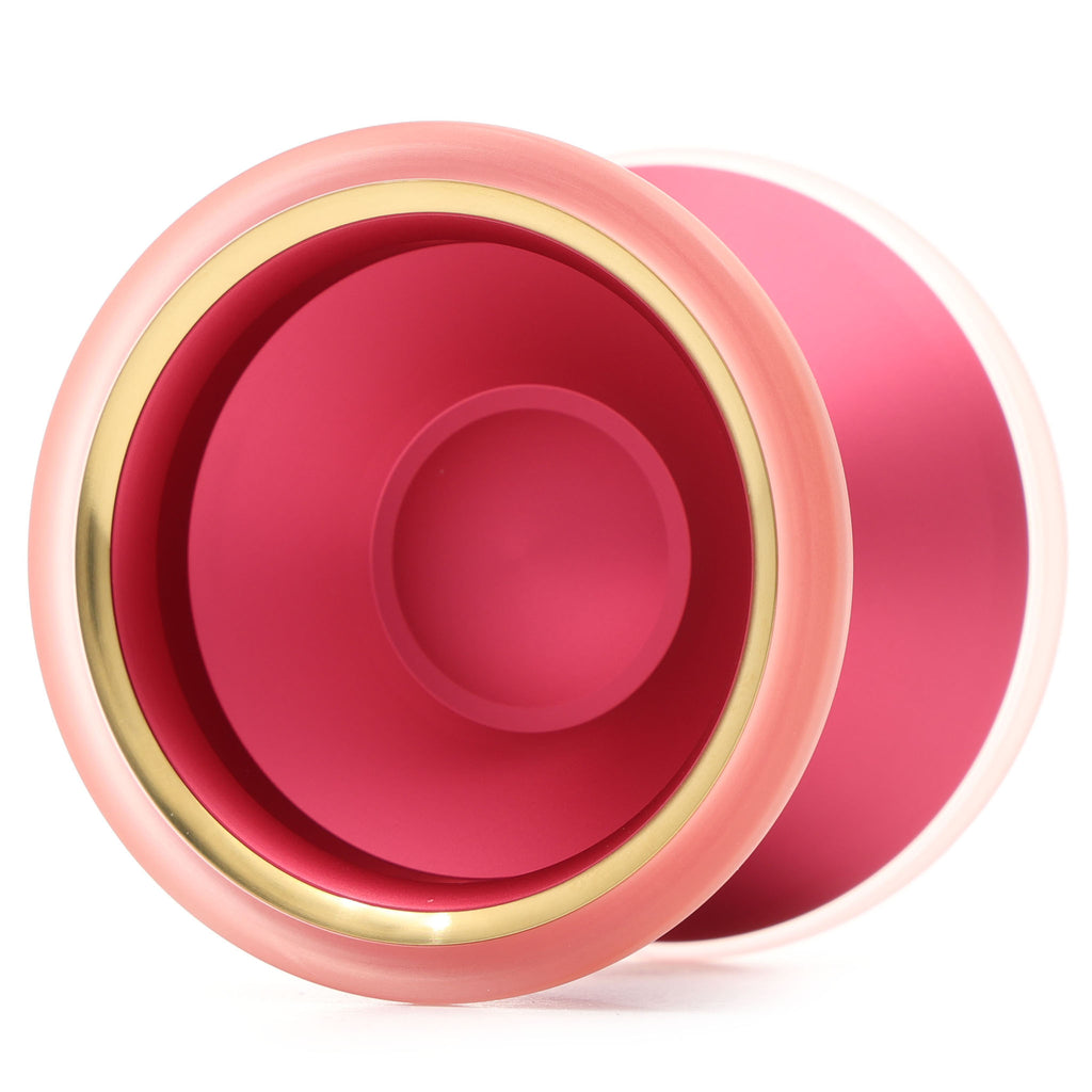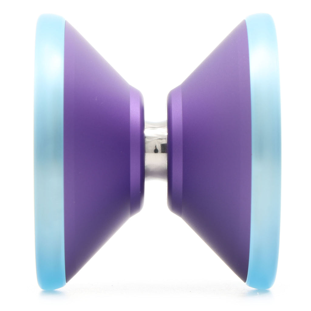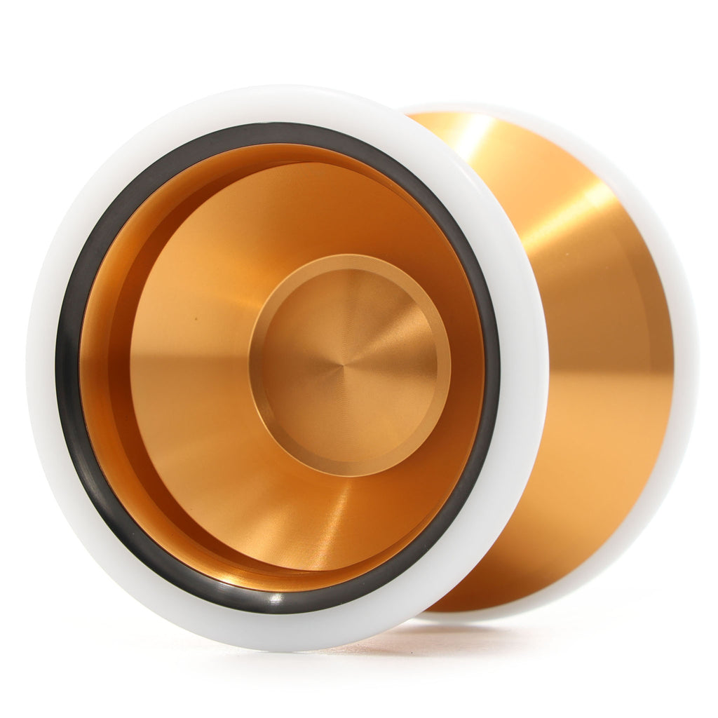 A6061ボディにステンレスのリムを搭載し、そのステンレスを覆うようにポリカボネートのリムが装着されています。塊のような存在感があり、ヨーヨーの位置を見失いにくくなっていながらも加えた力にダイレクトに反応してくれる、ヨーヨーを操っている感覚の強いモデルです。ステンレスリムはボディから幅方向にせり出すように配置されており、引っ張り感は減らしながらも安定感を確保しています。最外周のポリカーボネートリムは、ヨーヨーが手や体に衝突した際の衝撃を和らげ、かつ、ブラスト加工が衝突時の回転の減衰をある程度防いでくれます。